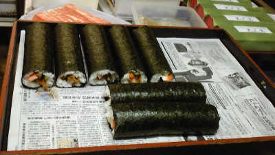 本日は、2月3日 節分です。小川屋では、例年特性恵方巻と鯨飯を販売します。夜明け前から、調理長が恵方巻を女将が鯨飯を作ります。小川屋の恵方巻と鯨飯は毎年好評をいただいており、宣伝しなくても、多くのご注文をいただきます。ありがたいお話しです。調理長と女将が手作りで作るため、あまり多くはできません。なので、ご注文の数量も限定です。今年もご注文分以外は出来なかった様子です。もっと頑張って作れば、もっと売れるのに~などと無粋な事を考える若旦那であった・・・・数量限定の手作りというのが良いんですよね~はい、はい我がまま言いません。ちなみに今年の恵方は「北北西やや西」!!毎年このビミョーな方角に???と感じてしまいます。とはいえ、食べる時には、あまり気にしてませんけどね~~