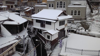 ホワイトクリスマス!! と言える程は積もりませんでしたが、雪降りました。朝から降ったり止んだりを繰り返していた雪ですが、夕方ようやく屋根の上に少し・・・有福温泉では例年、クリスマス前後になると、多かれ少なかれ初雪が降り、年末に向かうにつれ、少しづつ積もる雪へと変わっていきます。有福温泉は山の中にあるので、雪が降る時は結構な量が振ります。1冬に何回かは、長靴出動~~なんて事もあるのですが・・・積もった雪はあっという間に無くなります。というのも、有福温泉はボーリングして地中から持ってきている温泉と違い地表に湧き出ているお湯を集める温泉です。(←以前のブログにて報告済)温かいお湯が地表の近くまで来ているのです。なので地表は温かいのです・・たぶん なので雪が積もりにくいと、 じ~さまから聞きました。という事でもお分かりの通りでしょうが、冬の有福温泉のポイント!!雪の降った後に来るべし・・・ 山や建物は雪で真っ白になってても、車道には雪が無い。車で来易い!!有福温泉は湯冷めしにくいお湯なので、湯に浸かった後、寒い外で雪を眺めててもかぜひかない!!(←限度も個人差もあるのでお気をつけ下さい。責任は取りません。)さあ 皆さん。雪見にお越し下さい。お泊りも休憩も もちろん小川屋で~~ (←ちょっと宣伝)注:道路の雪が溶け易いという事は、道路べちゃべちゃという事です。 履物にお気をつけて、お越し下さい。