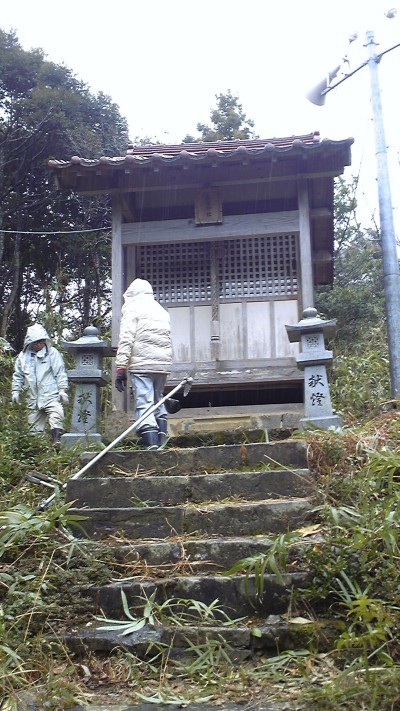 前回のお約束通り、金平山さくら公園です。さくら公園は「そば処 大福」の前の細い路地を登っていくとあります。昔から子供の遊び場として、大人の花見の場として利用されてきました。しかし最近では、遊ぶ子供も少なくなり、また花見をするにも、手入れしてないため、桜が枯れ、と荒れ放題になっていました。実はこの公園のある金平山の頂上には、厳島様や金毘羅様等々が祀られている温泉神社があり、頂上周辺には33体のお地蔵さまが配置されています。なので、登れなくなると困るので、湯町自治会では新たに桜を植樹したり木を伐採して、山の整備をしたりと頑張っています。どれがいる木、どれがいらない木と選別するのは、年配の方々。その指示で、僕たちが木を切り出していきます。頂上の温泉神社の周りまで終わると、今回の整備予定も終了です。この温泉神社の屋根に時々ムササビ君が住み着いています。屋根裏は傷んでしまうし、糞が落ちて汚いし・・・要注意です。今回は無事被害無しでした。神社の周囲のお地蔵さまですが、これらは1体1体に所有者がいます。小川屋もお地蔵さんを持っております。下の写真14番地蔵がうちのです。自分家のものになると、人間勝手なもので、ついつい他の地蔵さんより力を入れて掃除してしまいます。やっぱりひいきですし~ きれいにしないとバチが当りそうですしね~そう言えば、子供の頃もバチが当るからと掃除に登らされていたような・・・昔の子供は、そんな他愛も無い大人の詭弁に、素直に従っていましたね~大きくなるにつれ、そんな素直な心が無くなっているような気がします・・・お地蔵さんのそうじに言ってきま~す!!
