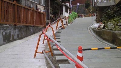 有福温泉の中心部にある無料駐車場。ここから温泉街に踏み込むと、石畳が登っていきます。現在、この石畳をリニューアル工事中です。昨年、御前湯周辺の石段を修繕、壊れた石も張替えました。この石は、江津市のお隣温泉津町で採れる「福光石」!!名前も有福温泉には、ぴったりの石です。しぶ~い色合いが、なんとも言えず温泉風情を醸し出します。今回は、石段から無料駐車場までの坂の部分と皐月湯前を張ります。上から下までしぶ~い「福光石」で張り替えられると、統一感のあるしぶ~い雰囲気で、有福温泉の魅力が更にアップ!!ですね~入浴客や宿泊客の方にご迷惑かけてはいけないので、半分づつ工事を進めています。出来上がりがとても楽しみですね~新しいものをド~ンといっきに作ってしまうお金も無いので・・古いものを利用しながら、少しづつ少しづつ変われれば良いですよね~少しづつ変わっていく事により、その度に宣伝もできて何回も何回も有福温泉に足を運んでいただけるのですよ~思わぬ効果でした~~