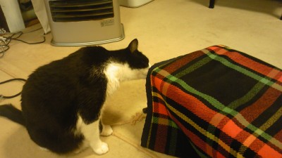 先週末から、全国的に冷え込みましたね~有福温泉も、またまた、大雪・・・沢山降り積もりました。17日から富山に出張に出ていた僕若旦那、富山の雪にもびっくりしてましたが・・富山に負けてませ~ん。この寒さの中、我が家では人間も猫様もストーブの前に集まって動きません。特に、我が家の猫様「ショーくん」(←名前の由来は以前の記事参照)人(?)一倍温かい場所をみつけるのが上手!!暖かいところでアイロンがけを~ と思いストーブの前にアイロン台を持ってくるとすさかず、寄ってきてアイロン台の下へ~~アイロン台の下にこもるストーブの熱とスチームアイロンの蒸気に猫様至福の一時です。夏のアイロンがけには、見向きもしないくせに~全く調子の良いやつです・・・ちなみに、我が家ではアイロンがけは僕若旦那の仕事です。だからかどうかは分かりませんが、僕が帰ってくると足元にまとわりついてくる猫さま「ショーくん」しばらく~無視してると・・何だアイロンかけね~のか!! という目でどっか行きます。そんな自分勝手な猫様「ショーくん」ですが、最近は、この寒さに家出もせず、おとなしく家の中で遊んでいます。時々、恨めしそうに窓の外の天気を眺めながら・・・ストレス溜まってんのかな~~