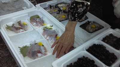 ここまで読んでこられた方は、もうお気づきだと思います。有福温泉はものすごく田舎の過疎の町です。なので、町には八百屋も魚屋もましてやスーパーもコンビニもありません!車を運転する人は、買い物に行けるので良いですが・・・何度も言いますが、有福温泉高齢化率高く一人暮らしのご老人たくさんおられます。そこで、毎週水曜日の夕方には魚屋さんが行商に来られます。わざわざお隣の浜田市からです。浜田には港があり、日本海の美味しいお魚が水揚げされます。一人世帯向けにおさしみは、一人分づつパックです。 ありがたい ありがたいもちろん魚一匹でも買えます。本日は、浜田の名産「のどぐろ」がたくさんいらっしゃいました。のどぐろですよ~ どんちっちですよ~ (←方言でのどぐろの事)さすがにテンション上がります。本日の夕食は「のどぐろ」の煮付けに決まり!かわいい「いか君」もおります。 悩んでしまう・・・魚屋さんは小川屋の駐車場の前で店を開いてくれます。なので、小川屋も水曜日は、夕方ここで仕入れします。朝、水揚げされたものなので、大変新鮮!! 活きがいい!!小川屋へのご宿泊、水曜日が狙い目かも・・・