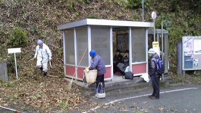 有福温泉・湯町自治会では、年に何回か集まって普段できない場所を清掃・整備します。(←人手が無いと出来ない作業です。)日程が決まれば、回覧板にて募集。都合のつく方が参加するシステムです。本日は、時折雨雪の降る悪コンディションの中、いつもと変わらぬ多くの方が集まってくれました。(かま、ほうき、かき、草刈機、チェンソーなど思い思いのものを手に・・・)本日のターゲットは、温泉街入口のバス停裏山の斜面と金毘羅神社のある桜公園!思い思いに持ち寄った道具で、思い思いできれいにしていきます。己の年を自覚して無理の無いように・・・若い(?)僕たちが、山に登り木を切り出したり、草を刈り出します。(↑僕の道具は、愛用の草刈機! 調子悪く時々止まるのがまたかわいい・・)切り出された木や刈り出された草は、年配の方や女性の方がかまやかき、ほうきで集め川の土手にほかします。約1時間の作業で、お客様をお迎えする有福温泉の入口バス停がきれいになりました~バスで来られたお客様はここが有福温泉の第一歩!きれいにしてないと、がっかりされてしまいますいね~~今日もバス待ちのお客様がおられました。「きれいになると気持え~な~! もう1泊したくなるわ~」と言っていただきました。有福温泉、年々人手が少なくなってしまいますが、これからも、頑張ってきれいにしていきますよ~~僕も、後10年は若手で頑張ります。(←10年で何歳になるかは内緒~)などと好き勝手書いていたら長くなってしまいました。さくら公園の方は、次回近日中にご報告します。最後の写真は、前回ご紹介した「そば処 大福」の大将「タクさん」です。本日も開店直前まで作業に夢中になってしまい、「お客さん来てるよ~」の電話にあわてて帰って行きました。今日も手打ちそば、足らなくなったのかな~~~