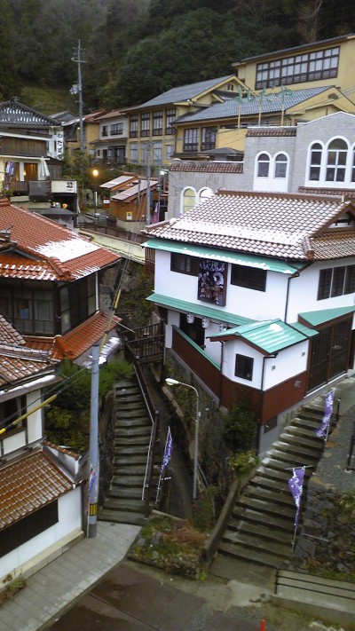 温泉街に一歩足を踏み入れると、階段・坂・せまい路地で入り組んでいます。今回はせまい路地のご紹介です。(階段は前回を参照下さい。)写真の路地は、温泉街では一番広い路地です。(これでも・・・)しかし、車は入れません。ここに住んでいる方々も、離れた場所に車を停め、えっちらおっちらと荷物を運ぶのです。有福温泉の方々は不便を諸共せず生活しています。大変です~しかし、悪い事ばかりでは無いのです。隣近所が近いのですぐ行けるし~目の前の家の人とは家を出ずに会話できるし~いすを出して、家の前に座っていても怒られないし~何より、安全とにかく安全です。車入ってこないので・・・おじいちゃん、おばあちゃんは真ん中をゆっくり歩いて、お風呂に行きます。クラクションなんか鳴らされません。子供達は道に絵を描いて遊んでいます。違う意味で怒られるけど・・・子供の頃の嫌な思い出!うちの母は家の中が汚れるからと、いすを持ち出しこの路地で僕の頭を刈っていました。バリカンで丸刈りに・・・通る人に笑われながら・・・こんな細い路地だと、知らない人は入りにくいみたいで・・営業の人や押し売りの人を、ここで見る事はほとんどありません。地元の銀行の人か郵便局の人か農協の人ぐらいかな・・・ちなみに写真に写っているスーツの人は御用聞きに来た信金の人です。 ご苦労様です~