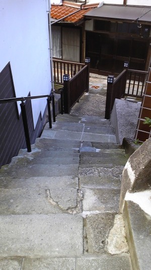 有福温泉は狭い谷間の中に、ひしめく様に建物建っています。そのため、温泉街は基本的に、坂と階段ばかりです。一番低いところを走る一本の道路のみが車が走れる道路で、それから入り込んだ路地は全て、人が歩く事しかできない小道です。しかも、そのほとんどが坂か階段!この階段は、近くの温泉津町福光というところでとれた福光石でできています。もう、でこぼことして古くなっていますが、その古い福光石で囲まれた風情が、有福温泉の情緒となっています。有福温泉の住民のほとんどが、この階段や坂を登ったところに家があります。家まで車が上がらないので、荷物を抱えて石段を登っていくのです。買い物が多い日は大変!何度も家と車を往復したり、「おいこ」に入れて運んだりします。有福温泉では、「おいこ」を背負って石段を登る姿をよく目にします。重い「おいこ」を背負って狭い石段を、すれ違いざま「ごめんなさいよ~」と言いながら登って行くのです。何歳になっても~ 元気ですね~僕はお陰様で、低いところに住んでいるので、毎日石段を登る事はないのですが、写真を撮るため久し振りに石段を登って行きました。かばんとカメラを抱えて、息切れしながら登っていく僕の横を「おいこ」を背負ったおばあちゃんが、「あんた、しゃあないかな~」「荷物持っちゃろ~か~」と軽やかに追い越していくのでした。75歳のおばあちゃんでした・・・。