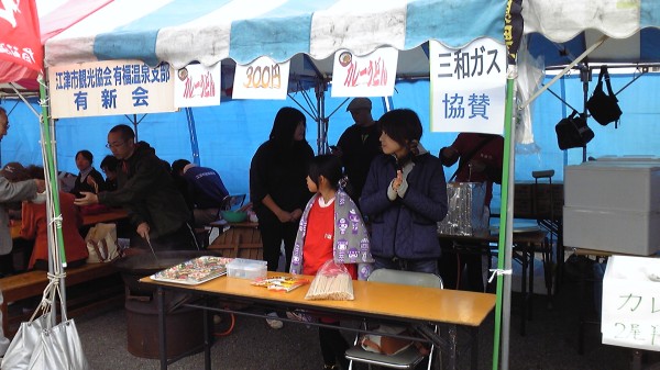 江津市の秋の一大イベント「ごうつ秋まつり」がありました。農産物の直売や飲食物の販売などなど・・・ありきたりなお祭りです。しか~し、娯楽の少ない田舎では、集客力は抜群です。なんと江津市民の人口ぐらいの人が集まります。(←市民何人だ?という質問は無視!!)小川屋も出店してきました。女将自慢(勝手に自慢)の「おこわ」「炊込みごはん」「よもぎ餅」板さん自慢(本当に大好評)の「ばってら寿司」「巻寿司」お陰様で、大好評に付き終了時間前に完売いたしました。感謝感謝です。有福温泉からは、小川屋以外にも出店がありました。若者の会「有新会」が カレーうどん を販売。主婦の会「朝市の会」が そば寿司 を販売。両方とも大好評でした。江津市の中でも人口の少なさ下から◎位の有福温泉から3店舗も出店・・・ 頑張りましたね~人口少なくなっても・・ 平均年齢上がり続けても・・・有福温泉、元気にがんばりますよ~