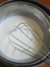 | 6. | 氷水にあて、とろみが出るまで混ぜる。(泡立てないように) バニラエッセンスはあら熱がとれたら入れる。 |