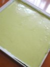 | 7. | 高めの位置から紙を敷いた天板に流し入れカードで平らにならし、180度に余熱したオーブンで5分、170度に下げて5~7分。 | ![]() |