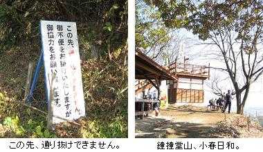 玉淀大橋で荒川を越える。11:00八幡神社でひと休み。社殿の裏手から山道が始まる。雑木林の急登はしばらくで、尾根道はやがて八幡山に至る。緩い登降の繰り返し、時折ハイカーと行き合う。急な木製階段で高度を上げて、11:55鐘撞堂山(330m)。小春日和に誘われたハイカー達で賑わっている。パンと紅茶で昼食休憩。