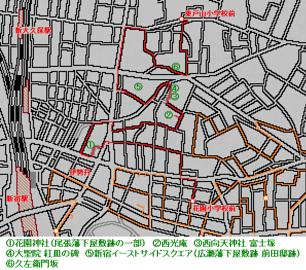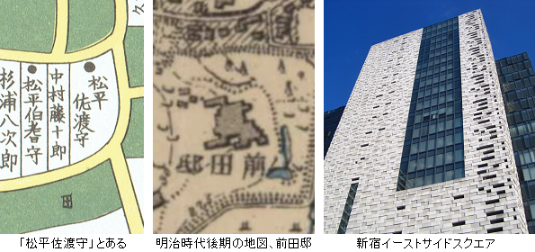 切絵図に「松平佐渡守」とあるのは、出雲国広瀬藩松平家(3万石 親藩)下屋敷。広瀬藩は出雲国松江藩(18.6万石 親藩)の支藩。明治時代に下屋敷跡地は旧加賀藩主前田侯爵家の別邸となり、当時の地図に屋敷が記されている。現在は新宿イーストサイドスクエアなどが建っている。