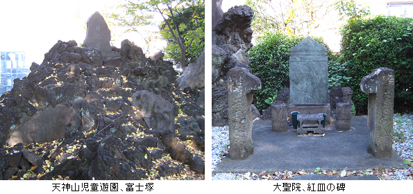 天神社北隣りの「大聖院」は、明治維新による神仏分離まで、西向天神社の別当寺だった。境内に中世の板碑「紅皿の碑」がある。紅皿は、太田道灌の「山吹の里」伝説に登場する少女。「七重八重 花は咲けども 山吹の 実のひとつだに なきぞかなしき」で知られる。道灌の死後、紅皿は尼となってこの近辺に庵を建て、死後その地に葬られたという。
