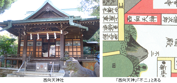 「西向(にしむき)天神社」を訪れる。安貞2年(1228年)創建と伝わる。切絵図に「西向天神」「不二」とある。天保13年(1842年)に富士塚が築造されたが、明治時代に撤去された。現在 天神社南隣りの天神山児童遊園にある富士塚は、大正14年(1925年)に再建されたもの。