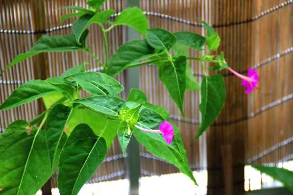 うちのベランダの鉢植えのオシロイバナの紅い花が咲きました。
