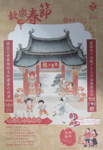 こんなチラシを入手していました。萬福寺の入山料は必要ですが、「萬福寺で体験できる中国春節文化」の催しへの参加は無料というメッセージが記されています。昨日の土曜日の実施、天気も良いし、地元でもあり、出かけてきました。 総門前は普段と大きな変化はありません。 参道を歩み、三門へと左折する前に、提灯が飾ってあります。その背後に見える屋根は。天真院の山門です。 三門 三門前の左(北)側に、帆船の縮尺模型が置かれています。特に説明の掲示はありませんが、船の支持台に「隠元禅師寶船」と陰刻されています。 山門前の右(南)側には、「萬福寺全景」図が設置されています。 これは三問傍の入山受付所でいただいたリーフレットに掲載の案内図です。対比してご覧いただくと、全体がイメージしやすくなることでしょう。 拝観のしおり 三門から出る時に、萬福寺全景図とは反対側(北)にこのパネル像が置かれていることに気づきました。入山の折には受付所側に意識が向き、見過ごしていたようです。上掲のしおりと同じ。羅睺羅(ラゴラ)尊者です。大きな違いが一カ所あります。それは胸を裂き開いて見せるその空間にあります。上掲の木像にはその中に仏の尊顔が内包され彫刻されています。パネルのその部分は穴が開いているだけです。ひょっとしたら、記念撮影スポット・・・? もしくは、深い意図を持たせている・・・・?この時併せていただいたものがあります。それは次回にご紹介します。 東に向かう参道の左(北)側と右(南)側に目をむけると、このように、参道の両側に赤い提灯がずらりと吊り下げてあります。 参道の正面を眺めた景色。参道の正面、「天王殿」に到ります。昨年、2024年12月9日付の官報で、文部科学省は萬福寺の大雄宝殿、法堂、天王殿の国宝指定を告示しました。12月15日の新聞には、萬福寺で国宝指定の記念式典が行われたと報じていました。併せて、「来年2月2日までの金~日曜には、夜間特別拝観もある」(朝日新聞)ということも併せて報じてありました。 北側の境内 鎮守社が見えます。 天王殿前の石段傍には、「都七福神」の幟が立ててあります。 石段の手前、参道の南側には蓮形のブロンズ製水鉢があります。 御堂の正面に掲げられた「天王殿」の扁額 天王殿の正面の外縁となる基壇上に置かれた大きな香炉長い線香が供えられています。 正面傍の提灯 堂内に入りますとお堂の中央正面に、「ほてい(布袋)」像が祀ってあります。姿からのイメージでは布袋様ですが、萬福寺では「弥勒菩薩」「弥勒仏」とされています。 (資料1)布袋と言う名で親しまれている僧は、契此(けいし)と称し、南宋の高僧で、定応大師と号したそうです。堂内の左右の壁面沿いに、四天王が弥勒菩薩(布袋)を守護しています。 「金玉満堂」と「福」という言祝ぎの字句が刺繍され、金龍が刺繍されています。ここでも龍と出会いました。 広目天 西方の守護神 多聞天 北方の守護神御堂の反対側には、 持国天 東方の守護神 増長天 南方の守護神天王殿の主尊である弥勒菩薩(布袋)の背面には、 大雄宝殿に顔を向ける形で、「韋駄天」像が安置されています。弥勒菩薩(布袋)の背後を守護するかのような立ち位置になっています。 韋駄天は「仏舎利を奪って逃げた鬼を追いかけて捕らえ、また、僧の危難を走って行って救ったと言われる神」(明解国語辞典第5版、三省堂)韋駄天走りという表現は、この神の俊足さに由来します。我が国で、韋駄天の存在が知られるのは鎌倉時代以降のことだそうです。禅宗系寺院では、伽藍の守護神として重んじられていて、庫裡に祀られることが多いそうです。梵名をスカンダ、またはカルッティーケーヤと言い、原義は「跳ぶ者」の意だとか。元はインドのバラモン教の神、シヴァの子であったとされています。仏教に取り入れられてからは、増長天に従属する8将軍の主領に位置付けられている神です。中国にこの神が移入され、その名が音写されました。「塞建駄・私建陀・建陀と音写されたが、その伝承過程において『建』のの字を『違』と誤写したため、韋駄天となったと考えられている」(資料2)と言います。おもしろい。同種の変容が他にもあるかもしれませんね。 天王殿の南西角側から建物正面の外縁を北方向に眺めた景色です。 反対側(南)に歩むと、天王殿と天王殿の南側にある鐘楼・伽藍堂・斎堂などの伽藍に向かうための回廊が繋がっています。今回は、天王殿の東側、韋駄天像の前の扉から外に出て、月台の先にある大雄宝殿にまず向かいます。 月台は、大雄宝殿の前面に設けられた大きな長方形の基壇です。その月台の上には、春節を祝うための行事を行う舞台として、大きなパネルが大雄宝殿寄りに設置されていました。次は、春節の行事と活動体験に焦点をあててご紹介します。つづく参照資料1) 黄檗宗大本山 萬福寺 ホームページ2)『仏尊の事典 壮大なる仏教宇宙の仏たち』 関根俊一 編 学研 p170補遺日本最古都七福神まい