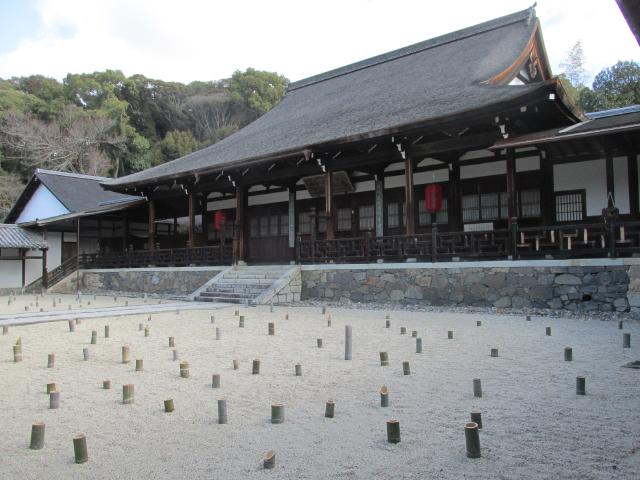 天王殿前の北方向への回廊から眺めた景色です。回廊の先、右(東)側には鼓楼堂、左(西)側には左下がりの回廊屋根が見えます。北方向に弧を描くように下っていく回廊の角からは、回廊の西に、南と西を筑地塀で囲まれた庭が広がっています。「中和園」と称されます。庭の散策路に入り、中央寄りにたたずみ、南から西に冬枯れの庭を眺めますと、 南方向には天王殿と境内社の背面 南西方向に三門の屋根 北西方向に開山堂の簗地塀 北方向に向くと、庭の向こうには開山堂に向かう回廊が、それぞれ見えます。この庭の北辺には、「中和井(チュウワセイ)」と称された井戸があります。左に中和井碑が建立されています。かつてこの地は後水尾天皇の母(中和院)方の生家である近衛家が所有していた土地で、徳川幕府が収公して、隠元禅師に寄進され、萬福寺が創建されたのです。(資料1,2)ここに中和院の大和田御殿があったそうです。その井戸の名残りだとか。この庭園は、1972年(昭和47年)隠元の300年大遠諱に合わせて整備されました。(資料3) 庭の小径から、回廊に戻って眺めた庭の景色球体状の石碑は何を象徴しているのでしょう・・・・・・。円満、和でしょうか? 回廊が平坦になったところ、回廊の屋根の棟柱に「合山鐘」が吊るされています。 この梵鐘の浮彫の龍と久しぶりに出会いました。社寺の龍像から始めて、今もインターネットで龍探しを続けていますので、やはり目が留まってしまいます。草ノ間が二段に仕切られているように見え、上の方には浮彫の獅子像が見えます。下帯の部分はうねっている造形が特徴的です。 北側から以前のブログ記事に記していますが、第6代千呆禅師によって元禄9年(1696)に再鋳された梵鐘だそうです。 回廊の右(東)側に見える「石碑亭」(重要文化財) 亭内には、亀趺が安置されています。隠元碑銘が刻されています。 宝永6年(1709年)建立。この顕彰碑には、隠元の特賜大光普照國師塔銘が刻まれているそうです。残念ながら私は判読していません。 (資料3,4) 回廊を左折する辺りで、北に見えるのが、「寿塔」です。回廊からの寿塔への通路は立入禁止になっています。この寿塔は隠元禅師が存命中に建てて置かれた墓。(資料4) いよいよ、「開山堂」(重要文化財)です。回廊もまた重要文化財。左上の箇所をご覧ください。 蛇腹天井の様式になっています。お堂をつなぐ回廊部分の屋根の天井とは異なります。他の主要なお堂も同じ蛇腹天井。萬福寺の特徴の一つです。 この扁額「開山堂」は木庵書。 隠元禅師像が安置されています。 開山堂の正面には、下部に半扉が設けてあります。「桃扉」と称されています。大きな桃の形が浮彫にされています。桃は古来より、不老長寿の果実とされ、邪気を祓うと考えられてきました。桃の意匠を施した門扉は、萬福寺に3箇所あると言います。 (資料5)おでかけいただき、後つの門扉を探してみてください。 余談です。お寺を訪れますと、山門やお堂の屋根の端に、留蓋と称され、獅子や牡丹などの彫刻された瓦が置かれています。留蓋に、桃が彫刻されている場合があります。この桃の彫刻瓦もまた、ここの桃扉の桃の浮彫と同趣旨のものなのでしょう。 開山堂は南面する形で建立されています。入母屋造、本瓦葺で一重裳階(もこし)付の建物です。大雄宝殿と同様に、桁行3間、梁間1間という大きさになります。 松隠堂この建物区域のつづき・東側は、開山堂の北側になり、 多くの鉢が並べられた空間を挟んで、これらの建物が立つ景色が回廊から見えます。 開山堂は、萬福寺の境内にあって、「通玄門」(重文)と白亜の築地塀で囲まれた一画です。 通玄門を出て、そのまま真っすぐに南へ境内を横断していきますと、 竜宮門(窟門)があり、その先に、天王殿の右(南)側回廊の右(南)端から屋根が見えた、この「文華殿」があります。この前をそのまま南に歩めば、鉄門扉の南門。普段は閉ざされています。さてこれで久しぶりの境内散策も一巡しました。三門を出て、冬季の放生池の景色を眺めて終わりにしたいと思います。 三門を出て、真っすぐに放生池の畔まで行き西を眺めた景色。冬枯れの景色が広がっています。南~南西方向の景色。築地塀の向こう側は塔頭「天真院」の境内地。 北~北西方向の景色。総門の屋根の手前にあるのは「看門寮」です。 その位置と名称から推測すれば、現在の守衛所・門衛所の役割を担った建物なのでしょう。 総門への参道を戻る途中で振り返って撮った景色。 総門のすぐ近く、参道の北側傍に右の石標「黄檗二代木庵老和尚塔所」が立っています。北に入る参道を進むと、塔頭「萬寿院」があります。ここには、黄檗宗二代の木庵禅師が葬られています。萬寿院は木庵の塔所として建立されました。 看門寮の南側を回り込みます。池の北西隅にこの石碑が建てられています。 放生池越しに三門を眺めた景色 最期に総門を撮って、探訪終了です。 受付でいただいたリーフレットよりご覧いただきあ