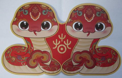 入山料を受付で納めた時、しおり、リーフレットと一緒にいただいたのがこの可愛いいイラストの二つ折りのカードです。このカードの裏が、中国春節文化の一端を体験できるスタンプラリー・スタイルの記録カードになっていました。 大雄宝殿は、江戸中期/1668年に建立され、桁行三間、梁間三間の規模で、入母屋造の一重もこし付、本瓦葺の建物です。(資料1,2)前回ご紹介の天王殿は、大雄宝殿と比較すると桁行五間、梁間三間で、横方向に二間分大きく、入母屋造、本瓦葺きは同じですが、屋根が一重です。この点も異なります。大雄宝殿と同じ1668年の建立です。(資料2) 上層の正面に「大雄寶殿」と記した扁額が掲げてあります。これは隠元書です。(資料3)天王殿を出て、月台の石段を上って、月台を横切り正面に設置された大型パネルを回り込んで、大雄宝殿の正面に出ます。 萬福寺の本堂であるこの大雄宝殿の正面前にも、大きな香炉が置かれています。 下層のこの扁額「萬徳尊」は木庵書です。(資料3) オープニングセレモニーはこの本堂で10:00と予定されていますので、少し早めに入りました。 儀式が始まる直前に撮りました。現在の黄檗宗萬福寺のトップである近藤博道猊下のスピーチがあり、その後「江戸時代隠元禅師伝来黄檗唐韻般若心経」が列席した僧侶たちで一斉唱和されました。「摩訶般若波羅蜜多心経」は日本では一般的には「まかはんにゃはらみたしんぎょう」と日本語読みしています。黄檗宗萬福寺では「般若波羅密多心経」を中国語読み(唐音)で「ぽせぽろみとしんきん」と読むそうです。「観自在菩薩」を「かんじざいぼさつ」と読んでいますが、これが「かんつざいぶさ」という読みになるとか。僧侶の唐韻によるお経唱えを聞いていて、「般若波羅密多心経」が唱えられているとはまったく思えませんでした。いわば一つのカルチャーショック体験のような感じでした。それと、猊下という用語は以前にどこかで見聞して知ってはいましたが、萬福寺でこの用語が使われているのは初めて知りました。この後、セレモニーは、場所が月台に移ります。 設置されていた赤い大きなパネルに、近藤博道猊下がその中央に「福」字揮毫をされるという儀式でした。 その後に、巳年生まれの人先着100名に縁起物「吉祥蛇」のマスコット贈呈などが行われていました。そこで、冒頭に掲げた春節カードの裏面が登場してきます。 そこには、春節文化の体験コーナーへのスタンプラリー参加が準備されていたのです。ものは試しに、あちらあこちらと戸惑いつつ動きまわって、このスタンプラリーに参加し、ちょっと戸惑い、楽しみながら、スタンプ集めをしました。どこに場所が設定されているのかわからずに、少し右往左往しましたが、ここでは整理編集してご紹介します。左側に一つ離れた位置のスタンプ印がコレ! 折紅包 「福」ポチ袋運試しのコーナーです。担当者にカードを見せますと、このパネルにかけてあるポチ袋を一つ取ってくださいとの指示。 これがそのポチ袋 手にしたポチ袋の中身はこれでした。パンダのキーホルダーのプレゼント。だけど、これはいわばハズレの類です。運が良ければ何かの景品との交換ができたようです。それでは右サイドの一番上のスタンプに移ります。 大雄宝殿前の月台には、本堂内での儀式の間に、大王殿側の石段の両側上部に、こんな蛇のキャラクター・マスコットが設置されていました。 マスコットの背面 少し離れて月台を撮るとこんな景色です。 「福」字が揮毫された大型パネルの両側には、机が設置されていました。そこは、一番上のスタンプの体験コーナー:写福字、つまり「福」書きです。スタンプラリーに参加した人たちが書いた「福」字が既にたくさん貼り付けてありました。 大型パネルの裏面にも「福」字が貼り始めてありました。さらに増えたことでしょう。 これは、大雄宝殿とその前の月台全体を、南西側から撮った景色です。上から二つ目のスタンプは月台の南西方向に参加コーナーが設けてありました。ここでの体験は、踢蹴鞠 けまり です。写真を撮り忘れました。直径15~20cmくらいの穴を高さ50cmくらいに開けた板が立ててあり、そこに竹を編んだような直径12cmくらいの木製球を蹴ってゴールするという遊びです。手に持った木球から手を放して足で蹴るのです。1mほど離れた距離から蹴るのですが、うまくいきませんでした。3つ目の体験コーナーは、回廊の所にありました。 大雄宝殿の正面の外縁は南方向とはこの回廊で繋がっています。これは南側から撮った景色です。下段の写真で言えば、回廊を右側方向に進めば大雄宝殿の外縁に到ります。ここでは、猜灯遊 灯籠クイズです。担当の人に尋ねると、 たとえば、こんな感じで、体験コーナーの近くの釣り灯籠に短冊がつるされていますので、そこに書かれた質問を探してその答えを教えてくださいというものです。「猜疑心」という語句がありますが、「猜」はうた