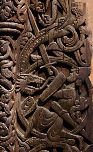 Hylestad Stave Church の門の右側の板の浮彫彫刻です。 12世紀後半の作