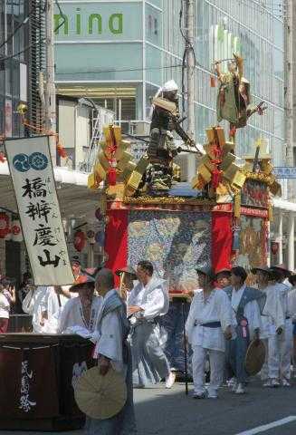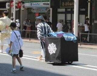 その後に、 くじ取らずの橋弁慶山が巡行の先頭 を行きます。各山鉾はその山鉾名の幟を保持する人が先導して、人々の行列、山あるいは鉾、人々の行列というパターンで続きます。