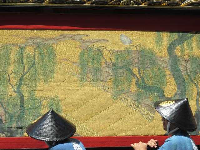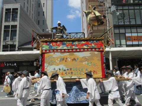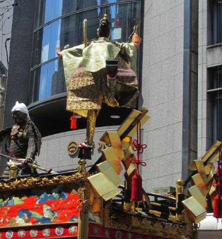 宵山の会所飾りでは二体の人形が横並びで安置されていましたが、巡行ではご覧の通り、 宇治橋の上で、三井寺の僧兵筒井浄妙坊の頭の上を、一来法師が飛び越える瞬間の場面 を表現しています。頭の上で、 一来法師は腕一つで全身を支える形に なっています。この場面を見せるために、様々な工夫がなされていることでしょう。見物客があっと驚く奇抜な場面設定と言えます。