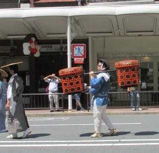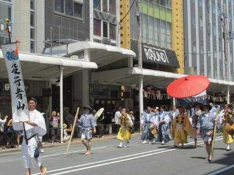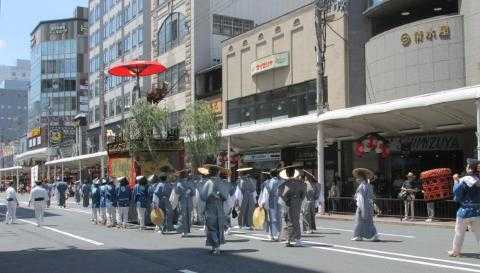 河原町通六角より少し南、BALというビルの前、河原町通の東側歩道から見物しました。パトカーを先導車として、 「祇園会」の幟を保持した人が先頭を歩みます。