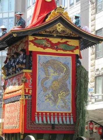 天の水引は 宵山の水引から、 塩川文麟が手掛けた という 緋羅紗地四神文様刺繍の天水引 に代えられています。 正面は朱雀