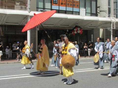 山伏姿の聖護院の僧 が山に搭載された御神体人形の役行者を先導する形で随行しておられます。