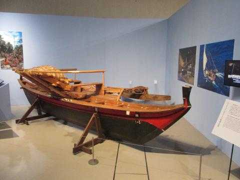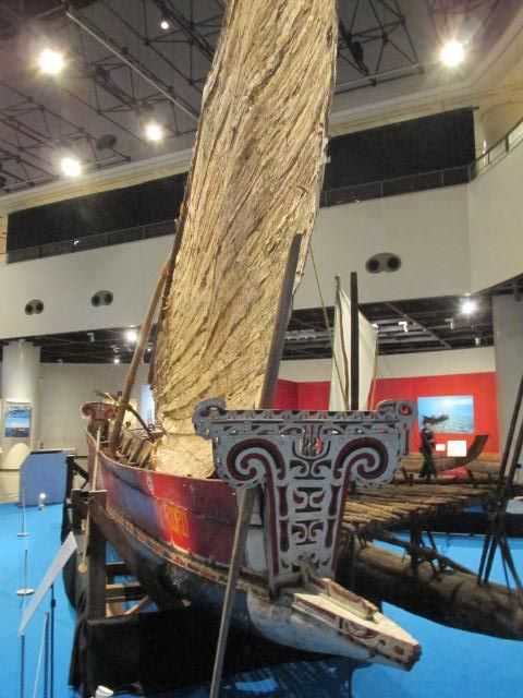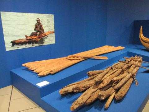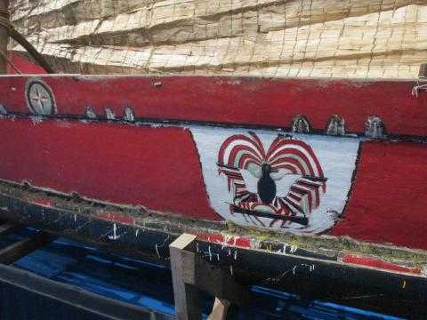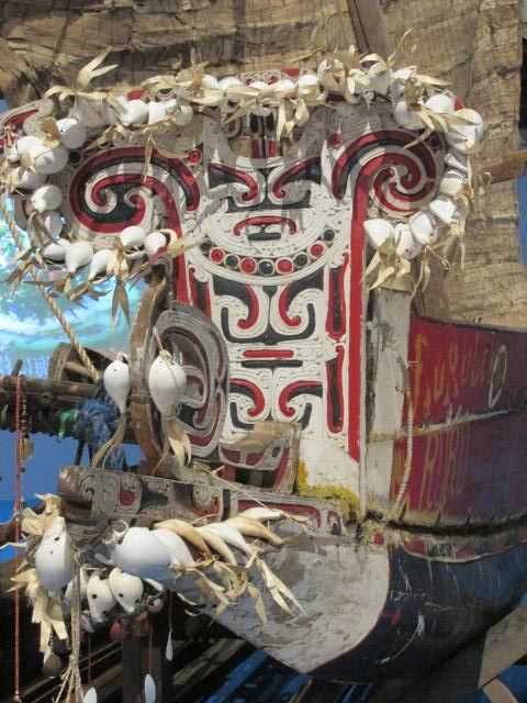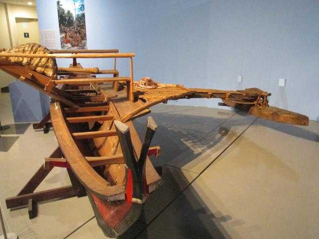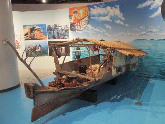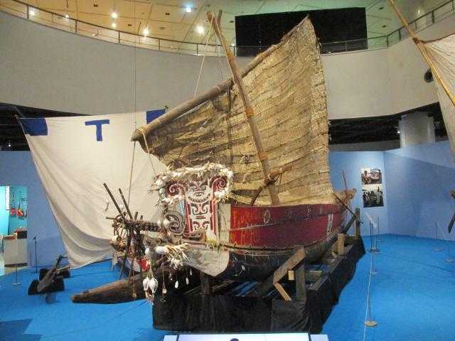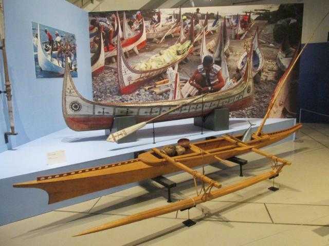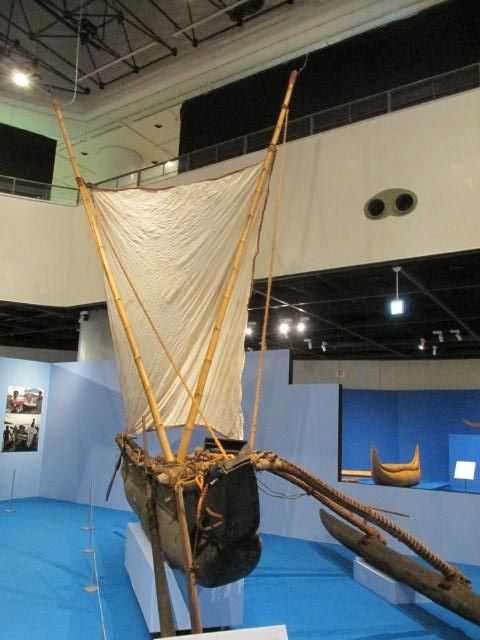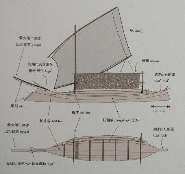 手前に置かれている舟は、 「カツオ釣り用手漕ぎカヌー」 シングル・アウトリガー式