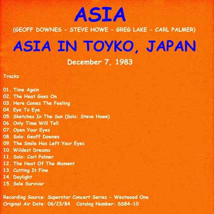 エイジアの初来日は1983年の12月。来日前に脱退したジョン・ウェットンに代わり、元ELPのグレッグ・レイクがヴォーカルで参加。ウェットン・ファンはがっかりしまししたが、演奏的にはなかなか好評でした。全米に生中継された12月6日の音源は、ビデオやCDで公式リリースされていますが、翌7日の音源も収録されていて1984年6月23日にオンエアされていたんですね。このたび某所にてゲットできたので報告します。ラジオ音源なので、音質はオフィシャル級です。タイトル:「Superstar Concert Series - Westwood One」Catalog Number: SS84-10当時のラインナップGeoff Downes - KeyboardsSteve Howe - GuitarsGreg Lake - Main Vocals & BassCarl Palmer - Drums & Percussion1. Time Againレイクガしっかりとベースを弾きながら歌っているのは意外。(失礼!)ただELP後期のビチビチと音がするピッキング音は好みではありません。2. The Heat Goes OnMCなしで突入。レイクはルート弾きで、ベースラインがきめ細かに作られていませんが健闘。ジェフのキーボードソロのまま次の曲に流れるアレンジが新鮮です。3. Here Comes The Feelingウェットンのベースラインを完コピするレイク、さすがです!ハウのリードギターは全開です。4. Eye To Eyeここでアナウンサーの案内が入って曲がスタート。この曲に限ってはウェットンよりもレイクのほうが上手かったりして。(笑)ハウの緻密なギターソロから、そのままソロタイムへ移行。5. Steve Howe Solo: Sketches In The Sun後にGTRに収録される曲ですが、この時が初披露でした。新曲のみで日本のファンにアピールしたハウ、さすがです。6. Only Time Will Tellカールがイントロでシングル・ヴァージョンの叩き方を披露。レイクの歌い方は間延びしていて切迫感がありません。エンディングもハウのソロで終わります。7. Open Your Eyesレイクがこの曲を歌っていたなんて驚きです!ハウのギターはオリジナル通りに弾いています。8. Geoff Downes Soloこれは新曲というべき、ジェフによるすばらしいソロ。Cutting It Fineの後半部へと続きます。9. The Smile Has Left Your Eyes違和感のある歌い方ですが、これはこれで良いかも。^^;あれ、ブリッジ部が省略されています。10. Wildest Dreamsハウのギターソロに尽きます!バリトン声のレイクには歌い難そうです。11. Carl Palmer Solo前曲の流れからカールのソロへと移行するパターンは新鮮!12. The Heat Of The Momentやはり違和感ありますね。しかしアンコールではないのが新鮮かも?「And now you find yourself in '83, the disco hot spots hold not charm for me」と歌詞を改変。それにしてもハウとダウンズのソロが長いです。13. Cutting It FineハウのMCでスタート。レイクはウェットンのような高音では歌えませんが、歌メロ部でオリジナルのベースラインを弾いているのには驚きました。エンディングはダウンズのソロに移行しますが、バンド全体で演奏しています。14. Daylight前曲のエンディングから雪崩込むパターン。レイクの声は限界を超えて苦しそう。ハウはこの曲に限ってはリハ不足かも。ジェフのアレンジは素晴らしいと思います。15. Sole Survivor原曲に忠実なダウンズのキーボードワークが光ります。レイクは枯れ声になりますが、なんとか踏ん張ります。全体を通してハウのリーダーシップを感じる演奏。レイクも思ったよりは上出来です。