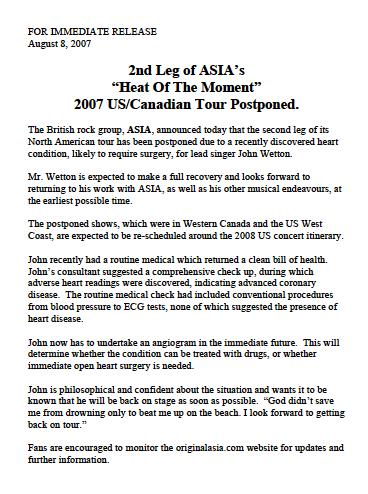 緊急ニュース!エイジアは今夏の北米ツアー(アメリカ、カナダ)を来年に延期しました。リードシンガーのジョン・ウェットンに定期健診の結果、心臓疾患(冠動脈疾患)が見つかり、精密検査を含む療養が必要になったためであるとのことです。ウェットンのオフィシャルサイトとエイジアのHPで発表。ウェットンの病状は精密検査の結果により判明するが、薬物治療が難しい場合は、開胸手術の可能性もあるとのこと。<キャンセルされた日程>Aug 17 Edmonton AB - Winspear Centre Aug 18 Calgary AB - Jubilee Auditorium Aug 20 Vancouver BC - Commodore Ballroom Aug 21 Portland, OR - Aladdin Theater Aug 23 Agoura Hills CA - Canyon Club Aug 24 San Diego CA - 4th & B Aug 25 Cerritos CA - Cerritos Center for the Performing Arts Aug 26 Cabazon CA - Morongo Casino - Ballroom Aug 27 San Juan Capistrano CA - The Coach House Aug 29 Phoenix AZ - The Dodge Theatre Aug 30 Tucson AZ - Fox Tucson TheatreSep 01 Las Vegas, NV - Mandalay Bay Hotel & Resort ウェットン本人は復帰の意思があり、バンドもメンバー変更などは考えていないとのことなので、ご本人の一日も早い復帰を祈ります!ゲストブックに励ましの言葉を寄せてくれたファンへのメッセージ"I have often found in my life that what I thought could be the worst thing that could happen to a nice fellow like me, has usually turned out to be the best thing"「ルビコン」の精神を感じさせる前向きな言葉ですね!この件に関するプレスリリース。近年の肥満、そして休む間もないライブツアーによるストレスでしょうか。アメリカでは、冠動脈疾患は男女とも死亡原因のトップになっている重病です。