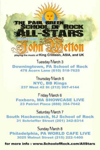 元キング・クリムゾンのジョン・ウェットンがロックスターを夢見る子供たちの音楽学校、「Paul Green School of Rock」の学生たちと再びジャムるようです。3月3日から8日までの5日間、アメリカ東海岸の都市で教室を開く模様。
