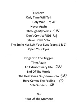 ウェットンが風邪をひいてしまったようですが、バンドの演奏自体は多少のミスを除き悪くないようです。JWとかSHとかというのはMC(曲紹介)担当者ですね。「Days Like These」は全体の演奏時間の関係で省かれたようです。ウェットンのベースペダル。