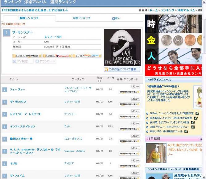 インターネット販売では好調なようですね。Omega #2 at CD Universe Friday, 21 May 2010 Asia's new studio CD has reached #2 on the internet-based CD Universe's bestseller chart, and is still in the top 75 on both the US and Canadian Amazon sales charts. ちょっと見にくいかもしれませんが。