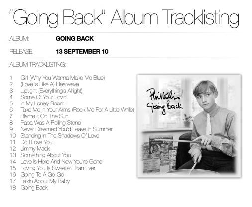 フィルの新作 「Going Back」は、スペシャルエディションが2枚組みでリリースされるようです。<収録曲> Girl (Why You Wanna Make Me Blue) (Love Is Like A) Heatwave Uptight (Everything’s Alright) Some Of Your Lovin’ In My Lonely Room Take Me In Your Arms (Rock Me A Little While) Blame It On The Sun Papa Was A Rolling Stone Never Dreamed You’d Leave In Summer Standing In The Shadows Of Love Do I Love You Love Is Here And Now You’re Gone Too Many Fish In The Sea Loving You Is Sweeter Than Ever Jimmy Mack Don’t Look Back Going To A Go-Go Goin’ BackTracklisting for disc 2 on Deluxe CD VersionTears Of A Clown Don’t Look Back Nowhere To Run Aint That Peculiar Aint Too Proud To Beg Too Many Fish You Really Got A Hold On Me You Keep Me Hanging On