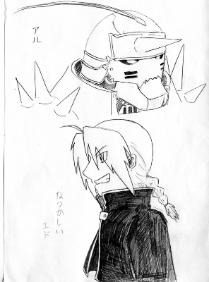 ラクガキは楽しいね! 記憶がアヤフヤでも何とかそれっぽいのが描ける(笑まぁ 楽しければ良いんだ うん、そうだ (自己解決?エドとアル 授業中に描いたゼ! 先生にバレそうで危なかった シセンガ・・・ ( ̄  ̄!) (▼ ▼メ)懐かしい! そして来年の4月頃からまた燃えだすんだ きっと・・・!アルの髪(チョンマゲ?)はもうなおったのかな?最近ガンガン読んでないから解んないや 単行本はちゃんと買ってる(笑)うろ覚えで描いたからなぁ 何かエド鼻高くね? 鎧アルにはトゲトゲが無いと 何かしっくりこない・・・うろ覚え最高---! (オマ 何だか グダグダだな・・・
