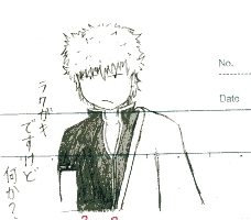 光・影:99%無視塗:ヤベー園児でも塗れそう線:所々震えてる(笑) あっ よく見たら右手首細すぎ・・・つか突っ込む箇所多すぎ!!!(爆) 傘が出来損ないのナルトみたいだ(笑)あとは神威とエドか・・・あとの二人も色鉛筆にすっかぁてか色鉛筆じゃなきゃメンドイアクリルガッシュとか顔彩あるけどねぇ後片付けが・・・あー!線画のときスキャンしときゃよかった(汗)そしたらPCでも塗れた・・・・カモとにかく、リク一つクリア!!! やっとね春休みに全クリできるか・・・!?明日は銀魂だ!! キャッホーーー★マル「姉ちゃん明日一緒にみよう★」姉「神威でてこないからヤー」マル「エー」余談学校で進級製作のときに、後ろ向いて友だとと喋っていたんですよそしたら廊下から美術の先生「おいマル・・・ちょっと来い」(ヤッベェ怒られる(汗)怒られる覚悟で行ったら美術の先生「おまえ、下の名前なんて読むんだ?」マル「・・・・・へ?」ちょっ!! オマ先生読めんのかい!!!終業式でもらった認定証の名前には振り仮名ふってあったぞ?!そんなうちの名前読めないのか・・・?!大抵男の子の読み仮名で呼ばれるもうイイさ! 別にイイさ!!名前教える方が最近楽しくなってきたから(笑)さらに余談前に「店長の息子さん?」と聞いてきた人がまたやった(一応言っておきますが私は女です)「君のお母さん(店長)テキパキ動いてすごいね!」だから私は店長の子供じゃねーよ!!!イイ人なのにな(笑)ちなみに私のアルバイト先はパン屋です。確か4月12日のPSの番組にでるそうです。店の名前は何となく伏せときます。放送されるどれかのパン屋でバイト中私は映っていません取材では芸人のノンスタイルさんが来たそうですよ。のぉああああ会いたかったよーー。