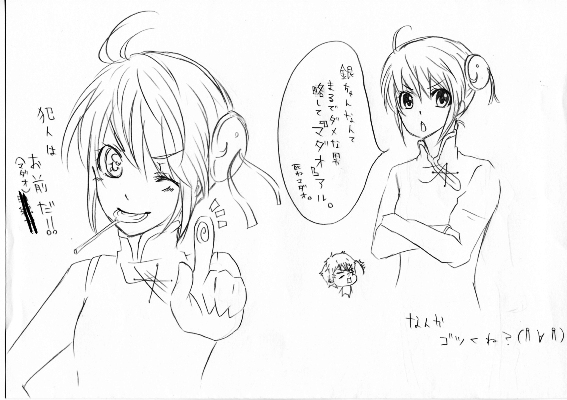 おひさ~残りのリク絵まだ描いてません サッキガ・・・ ( ̄  ̄!)\(▼ ▼メ)残りは確かロイかエドいわれたから、エドにして神楽か中尉って言われて・・・神楽描いたんだよね? あとは色塗り!と・・・神威かな??明日は早く帰れるので、できれば明日、全部の線はクリアしたいと思っています。で、のっけて また開いてる日に色塗ろうかなぁ 思ってるところですパソコンで色塗ってみたいけど、無料ソフトとかあるのかなぁ探すのめんどくさいな (ォィ)まぁ、色鉛筆になると思いますけど・・・あと、友達に神楽ちゃんを(授業中に)描いてもらいました!ヤベ!神楽ちゃん可愛い! お持ちかえr「ホァチャーー!!」ぶべらー!!!ふっ、ガードが固いゼ 神楽ちゃんふつくしい!!やっぱ、自分流があるって良いよね!・・・・イイナァア(゜ロ゜)
