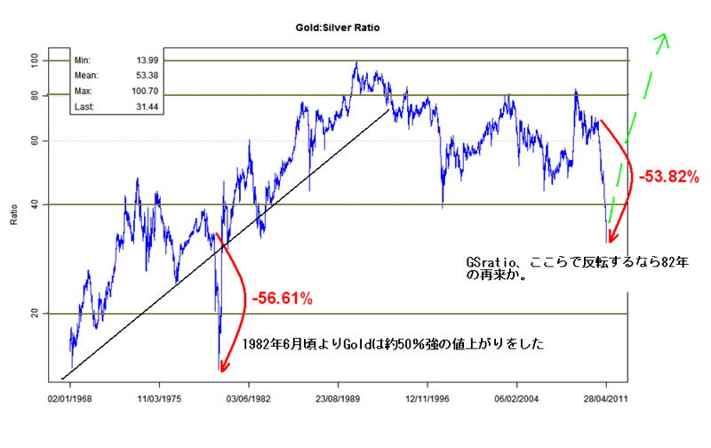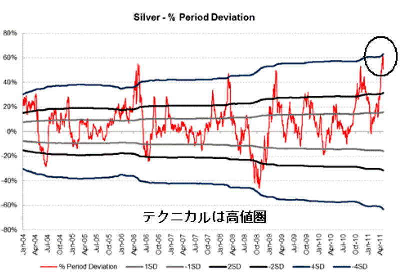 5月3日の日記 「短期」 短期:テクニカルは高値圏を示す。待っていた押し目買いの機が到来するものと考える。CMEグループは、4月29日引けから、コメックス銀先物の投機家向け当初証拠金を1万2825ドルから1万4513ドルに、維持証拠金を9500ドルから1万0750ドルに、それぞれ引き上げをした。昨年から何度かCMEは証拠金を段階的に引き上げているが、引き上げた数日は下落し、その後は上昇に転じてきたのがこれまでのパターン。今回も同様になる可能性がある。そうなるのを見極めてから買っても遅くはない。ジム・ロジャースは、この位置で銀を買い増しをしたくないと言っており、筆者も、それは同様だ。ただロジャースは何処で買い増すとは言っておらず(それは当然だろう、自分の手の内を見せることはない)。では、どの辺で買い増しをするか?過去5年の銀足は毎年4月5月に高値をつけて、その後3~5月後に反転上昇している。本年も同じような値動きとなるのか?しかし、昨年以降から上昇の仕方が違ってきており、それはドルへの信認が急降下となっている現況と、金より手軽な値で買える銀への需要の高まり等々から一昨年までの環境と様変わりになっている点だ。押したらすかさず買ってくる強気な勢力の存在があることを忘れてはいけない。では、どの辺りで買い増しをするか?左チャートはJ・Turkの分析にラインを付け加えたのだが、強力なサポートラインまで若し下がってくるのなら買う位置だ。レバレッジを効かせた買いは相場急変時に泣く泣く損切りをしなければならない事もあるので、枠一杯に買うのは避けたい。万が一ここから$30前半まで下落することがあれば、そこは天与の買い場だろう。最上段に掲げたPeriod deviationも過去の72-74年代と78-80年代はテクニカルもなにも関係なく短期で強烈な上昇をしたことがある。5月連休以降、突如の金融異変や戦争などが勃発するなら金も銀も他のコモディティーは軒並み急上昇するかも知れない。安く買った現物を急落に驚いて利益を確定してしまうのは愚の骨頂である。「金銀における中長期ファンダメンタルズの一つ」FRBによるUSドルの大量供給は広く知れ渡っており、その為にUSドル安への方向は中長期で変化はないと考える。短期ではQE2が終わるとされている6月以降どんな変化をみせるのか注目している。筆者の予想はQE3があるもとのと予想する。いずれにしても大量のグリーンバック供給が金銀を代表とする商品相場を押し上げてきたのであり、今後も輪転機を回転させなければならなず、QE2で終了となればマネーサプライ休止&金利上昇すなわち株式暴落、商品暴落となる。商品暴落はともかくも株式暴落を、バーナンキはさせたくないだろう(バーナンキの思惑を超えて、いつかは暴落する)。マネタリーベース急上昇が上段の米国と似ている国家がある。米国の商品相場関係者が注目する国とは。