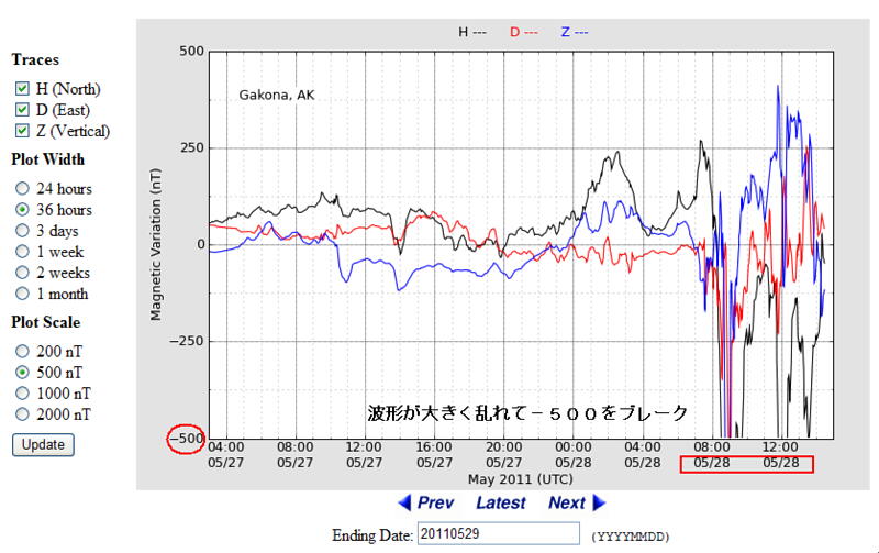 HAARPの波形が大きくぶれている。 通常、-500までのグラフで表示されるが、今回は収まりきれないので-2000でUPDATEしてみると、 3・11と4月7日(宮城県沖地震M7.6)の時より、大きくぶれている。http://plaza.rakuten.co.jp/atlanticsalmon/diary/20110421/筆者は狼少年ですから気にしないで下さい。さて、3・11は14:46:43に発生したのだが、その振幅アニメーションを見ると改めて異様で巨大な地震であったのを思い知らされる。アニメーションは14:51:40で終了しているが、約5分間と震源地から振動が伝播していき収まるまでの時間が非常に長い。過去の地震における最大振幅図にある過去の日付の振幅アニメーションをクリックすると閲覧できる。http://www.hinet.bosai.go.jp/AQUA/max_amp.php