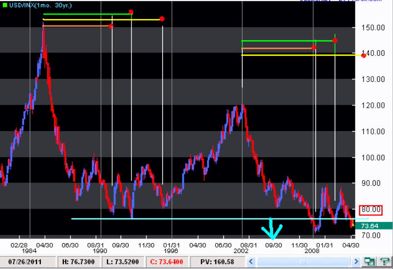 最近、ブログの更新をサボっておりました。株先の動きは、しっかり見守っております。今夜のオバマ大統領の演説に金融市場は歓迎の意を表しておらず、ダウ先物は-85.00(日本時間23:58現在)の$12465、S&P500先物は-4.5の1329とプラスではない。ドル円は78.0365となっている。以下はDollar index 30年月足チャート。http://www.fxstreet.com/rates-charts/usdollar-index/80.00をブレークしてからは大した反発もなく再度74を切っており、以前に記したように72が米国にとっての分水嶺となると想定するのは現在も変りません。中期でドル円は70円を割って60円台乃至は50円台が有り得る。FXでUS$の買いは超々短期ならともかく、中長期の買いは財産を失うと考えます。