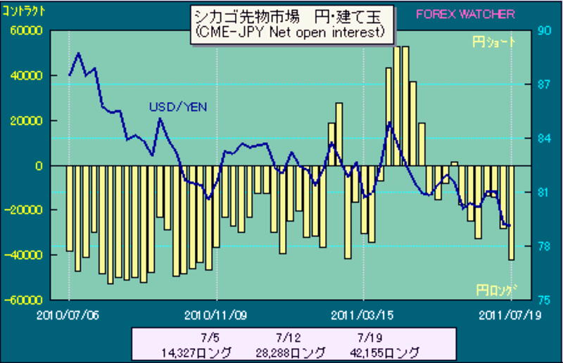 株先は10100円台の売り玉を27日の引けで利喰ったが、夜間取引では10000を割って9950円(23:30)まで下落。うーん、もう少し粘れば良かった。ドル円の円ロング(円買い)$ショート(ドル売り)が積みあがっているので、日銀の介入となって、短期のスクイーズ(玉絞め、つまり売り方を締め上げること)が起きると考え、短期の円安(1円~精々3円か4円)に振れるなら、日経平均は上げると読んで先物売りを手仕舞った。 上図はシカゴ先物市場の円・建て玉推移(7月23日時点の通貨取引建て玉の週間単位表)は円ロング(円買=円高)に傾いている。