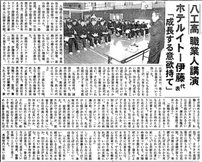 先日の八幡浜工業高校での講演に関して、市内の新聞にて掲載して頂きました。記事に関しては、私の喋った内容をとても上手くまとめて頂いていて、実際にお話した内容よりも、かなりレベルが高い講演だったかのように思われる方もおられるかと思います。実際には、大いに世代間ギャップ感じる中で、ウケる話題を模索しながら喋ったような形でした。記事を書いた方の編集力の素晴らしさに感謝です。この講演会においては、高校生に対して偉そうに喋ったりしてしまいましたが、今日の松山からの帰りのJRで隣に座らせて頂いた大先輩との会話の中で感じたことがまだまだ青二才である自分自身の未熟さ。松山駅でお会いして、喫茶店でお茶をご馳走になり、また続けてJRの社内でも様々なお話をすることができました。その会話の中で感じたことは、大先輩の一つの話題に対しての洞察の深さ、そして関連する話題の広さ。私は、ただただ感心するのみでした。最近、一人で松山に行く時には、時間を有効利用する意味でJRを極力使います。そこで、南予の先輩経営者の方々とご一緒させて頂くことも多く、色々なご指導やご助言を頂く機会に多々恵まれています。そもそもは、体を休めたり、本を読んだりという目的での公共交通機関利用ではありましたが、様々な学びを頂くという思いもよらぬ恩恵を享受しています。冒頭の記事の見出しの「成長する意欲持て」誰に対してよりも、先ずは自分自身に対して、常に放っていかなければならない言葉です。