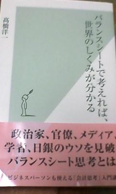 「バランスシートで考えれば、世界のしくみが分かる」高橋洋一 著光文社新書 世界における公用語人口ランキングの一位は英語、二位は中国語です。ただし伝える(メディア)という意味での広義の言語としては、数学と楽譜、そして複式簿記が上位に入ってきます。 この本は世界共通言語の一つである簿記の中でもバランスシートを用いて、財政や金融政策を解明しています。 例えば埋蔵金の発掘方法。これは資産側(借方)と負債・資本側(貸方)のアンバランスな差異(資産超過?)に着目することで、その存在が明らかになります。 どこかで聞きかじった話ですがが、明治期に政府の腐敗を一掃するために、大隈重信が政府の公会計に複式簿記を導入しようとしたらしいです。結果は、山縣有朋らの反対に会い、失脚したという話があります。 ということは、明治以来、政府の財政は不透明なままで進んできたということで、今ようやく、その改革が始まったという話なのかもしれません。 そう言えば、南予出身で国会議員になられた桜内文城さんは、財務省時代に公会計制度改革の中心メンバーだったという話を聞いたことがあります。 ためしに「桜内文城 高橋洋一」とyahooで検索してみると、経済学者の池田信夫氏が書いたこの本に関する書評ブログがヒットしました。 池田氏はこの本を絶賛しつつも、デフレ脱却の金融政策(日銀のバランスシート拡大)の部分に関しては批判をされています。そこに参照すべき正しい論として、桜内さんの書籍が引用されていました。 何度かお会いした桜内氏ですが、実際に経済政策の立案に関しては、かなりの力を持たれているというのは真実のようです。是非とも、国政において力を発揮して頂ければと思います。 しかしながら、「分かった」つもりにはなるけれど、本当に「分かった」のかどうかは我ながら怪しいと思うこの手の本。 曖昧な部分も多いので、景気高揚に関する部分を中心に、少し復習してみようと思います。