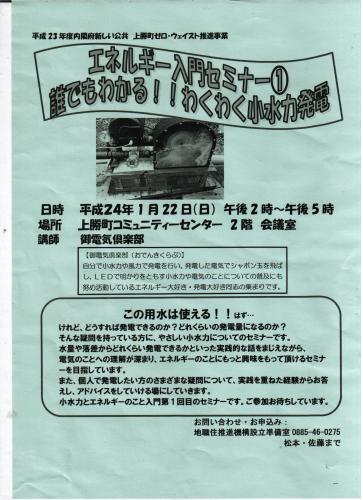 先日エネルギー入門セミナーがあるというのでお話を聞きに行きました誰でもわかる!!わくわく小水力発電だって(^0^)/ 会場に行ってビックリ!いきなり先生の口から専門用語がポンポン出るじゃありませんか中学時代にうっすら聞いたことがあるようなないようなオームの法則とかフラミンゴの右手の法則とかまるで動物園の鳥の名前みたいだわかりやすく説明してくださるのだが目がしょぼしょぼに・・・理論は???だったが実演はわかりやすいですねチャリンコのハブダイナモってのを水の力で廻すとLEDライトが点灯しました上勝町月ヶ谷温泉前にも電気が灯ってますこちらはT芝製の全自動洗濯機のモーターを水で廻して電気をつけてます洗濯機にそんな能力があったとは\(◎o◎)/じゃぁ