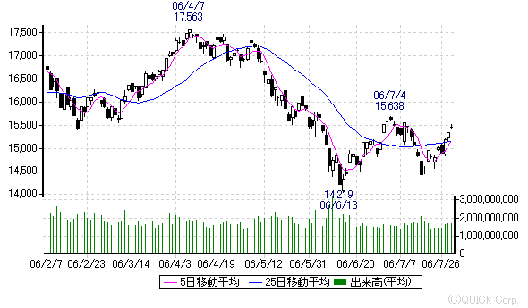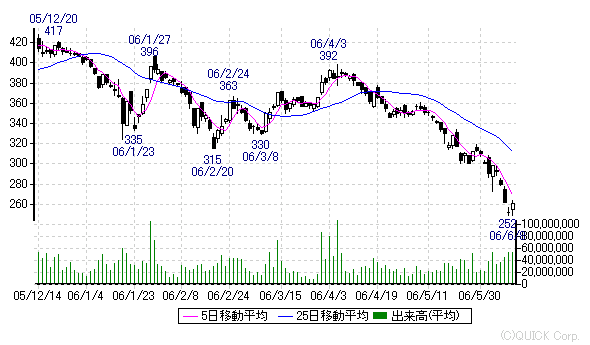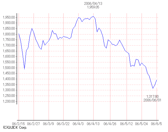 週末の米国市場が堅調となったことから買い先行の始まりっていうとこまではセオリー通りで、結局は寄り天で終わっちゃいましたね^^先週で底打った感じだったけど、まだまだ甘いのかな。やっぱり秋くらいまでの調整が必要なのかな。それにしても新興市場、下げ止まりません…優良銘柄で買い残が整理されればかなりお買い得価格になってるんじゃない?こんな下げ方は絶対に買いチャンスだと思うんだけどなあ。マザーズ指数です。こんなですよ?ま、その前がとんでもないくらいの右肩上がりだったんですけど。それと明日、大和投信「ダイワ金融新時代ファンド」設定で、金融関連がこれによって当分賑わうとか。今日もメガバンクは日経平均と比べると堅調だったのかなって感じでした^^さて、今後どうなるのでしょうか。