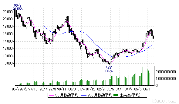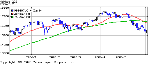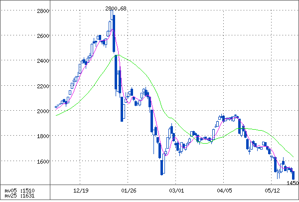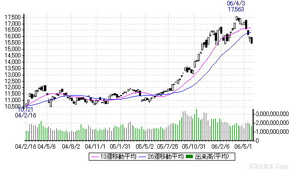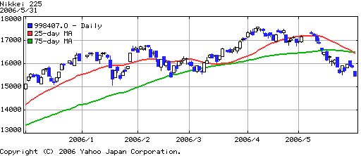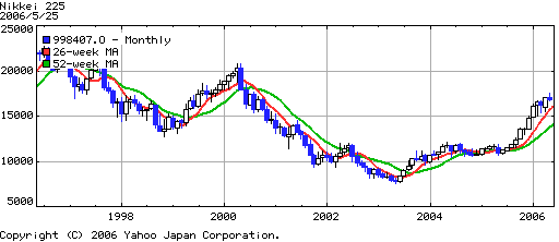 東証1部の業種別株価指数では33業種すべてが上昇し、値上がり銘柄数は全体の75%強で、値上がり1283、値下がり320、出来高は16億4656万株。売買代金は2兆3563億円。東京外国為替市場では、1ドル=112円近辺。まだまだ一時的な反発でしょうか。とりあえず、長期的に日経平均を見たらこうなりました。ここ最近大暴落な感じなんだけど、こうやって見ると何でもない感じですね。15000円割れくらいを想定してても大げさではないかなって思いました^^しばらく続きそうな調整、みなさん我慢しましょう!でも、MSのジョン・R・アルカイヤさんの予想だと、2008年には日経平均は20000~25000円を目指すとの事ですよ。来週は、4月商業販売(29日)、4月失業率、4月家計調査、4月有効求人倍率、4月鉱工業生産、2年国債入札、健康コーポレーションが新規上場(30日)、4月毎月勤労統計、4月建築着工、4月住宅着工、4月建設工事受注、SBIフューチャーズが新規上場(31日)、10年国債入札、5月新車販売、クールビズスタート、改正道路交通法施行、改正消防法施行(1日)、スタイライフ、ティアが新規上場(2日)。