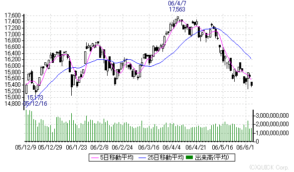 バーナンキFRB議長が、インフレへの懸念を表明し、さらにイラン問題で原油価格が高騰だったのでNYダウとナスダックが急落。その流れをそのまま受け継いで日本も大幅安。リバウンド期待も虚しかったですね^^新興市場も早くも利益確定売りが出たとの事で、この地合の悪さは半端なものではありません。SQも週末に控えてるし。今日発表された新レーティング!6/6 8830 住友不動産 CS UP継続 2100円→2400円 6/6 4188 三菱ケミカルHD モルガンS Equal→Under格下げ 6/6 8036 日立ハイテク モルガンS Overweight継続 4100円→4400円 6/6 8035 東京エレクトロン モルガンS Overweight継続 1万1000円→1万1500円 6/6 7731 ニコン モルガンS Equal-weight継続 2150円→2700円 6/6 7729 東京精密 モルガンS Equal-weight継続 9600円→7500円 6/6 6962 大真空 みずほ 1→3格下げ 6/6 6756 日立国際電気 モルガンS Underweight継続 1550円→1450円 6/6 5486 日立金属 モルガンS Overweight継続 1400円→1550円 6/6 4835 インデックス メリル 売り→中立格上げ 6/6 4183 三井化学 モルガンS Underweight継続 780円→610円 6/6 4004 昭和電工 モルガンS Overweight継続 500円→580円 6/6 3436 SUMCO みずほ 2継続 7900円→8000円 6/6 3407 旭化成 モルガンS Equalweight→Overweight格上げ 880円 6/6 6995 東海理化 日興C 2M→1M格上げ 3400円→3100円 6/6 9104 商船三井 CS OP継続 1080円→1090円 6/6 6971 京セラ みずほ 2→3格下げ 6/6 6900 東京電波 みずほ 3→4格下げ 6/6 6976 太陽誘電 みずほ 2→3格下げ 6/6 4088 エア・ウォーター 日興C 1M継続 1340円→1450円 6/6 6779 日本電波工業 みずほ 1→3格下げ 6/6 6857 アドバンテスト モルガンS Equalweight→Overweight格上げ 1万6500円→1万6000円 6/6 4042 東ソー モルガンS Underweight継続 520円→440円 6/6 4042 東ソー 三菱UFJ 3継続 560円→530円 6/6 5410 合同製鉄 三菱UFJ 2→3格下げ 6/6 7248 カルソニックカンセイ みずほ 2→3格下げ 6/6 1979 大気社 三菱UFJ 2→3格下げ 6/6 6981 村田製作所 みずほ 1→2格下げ 6/6 5803 フジクラ CS N→OP格上げ 1470円→1490円 6/6 7259 アイシン精機 JPモルガン 新規Neutral 4300円 6/6 9107 川崎汽船 CS OP継続 890円→950円 6/6 6902 デンソー JPモルガン 新規Overweight 5000円 6/6 4005 住友化学 新光 2+→2格下げ 6/6 4005 住友化学 モルガンS Equalweight→Overweight格上げ 860円→1040円 6/6 1332 日水 みずほ 新規2 620円 6/6 7230 日信工業 CS N→OP格上げ 2167円→2450円 注目するのはもちろん4835インデックス!これから反撃開始ですよ、ジャッカルRさん!!!メリルリンチ日本証券は6日付のサマリーで、インデックス・ホールディングス(IndexH)のレーティングを、弱気の「売り」から「中立」に引き上げた。携帯電話向けコンテンツ事業などを傘下に置く持ち株会社で、過去1カ月で同社株は40%程度下落し、同証券が妥当と考える株価水準(10万8000円~13万円)への訂正はほぼ完了したとし、これを投資評価引き上げの理由としている。 提供:(株)株式新聞社