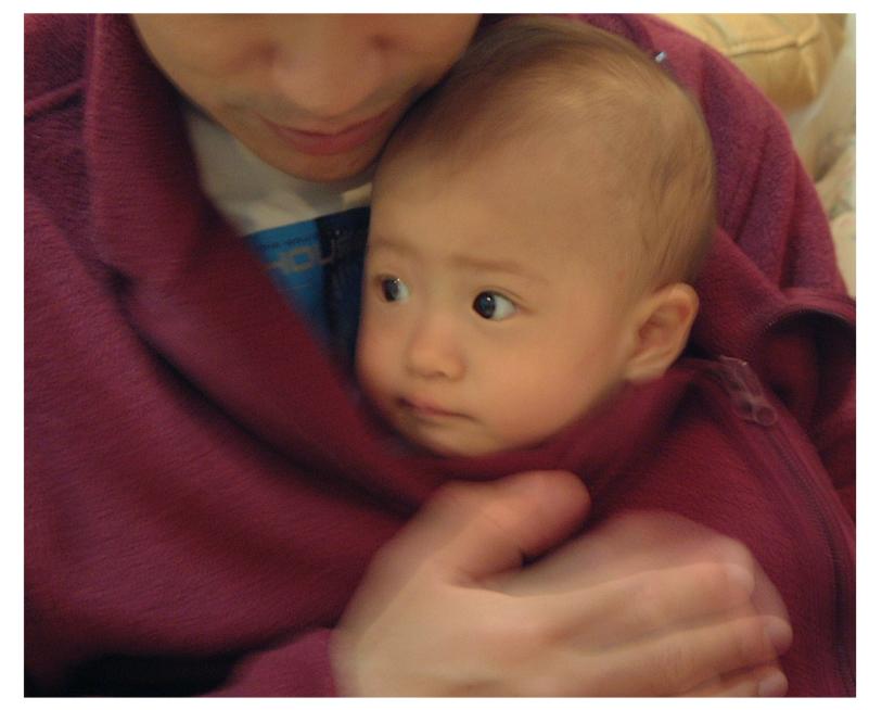 身動き取れなくなる子供は、ちょっと迷惑顔?