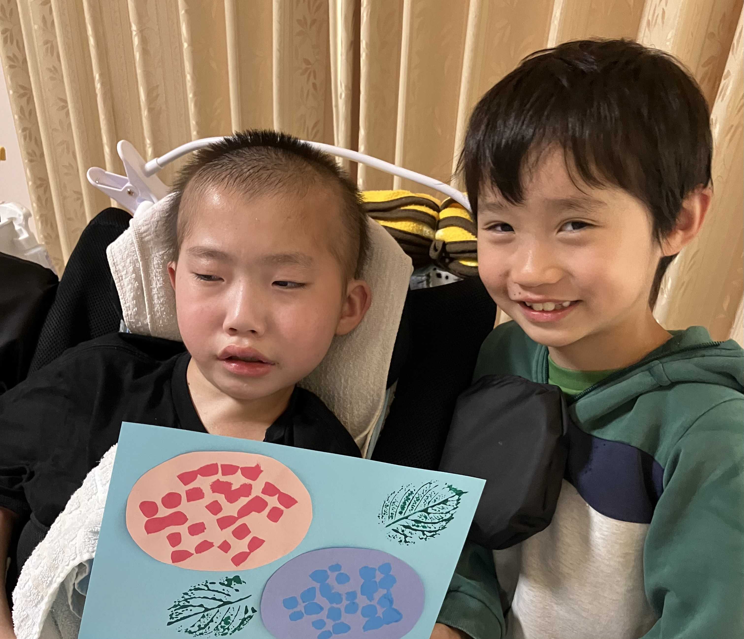 ~10歳長男🐻(小5)~昨日は3ヶ月ぶりに放課後等デイサービス「どんぐりコロコロ」さんへ行った長男🐻久しぶりに会ったどんぐりさんの方みなさんに「大きくなったねー😳」と言われていたそうです(笑)スタッフさんに抱っこや長座位姿勢をとってもらって、英語の歌を聞いたり、ピアノ絵本を弾いて穏やかに過ごしたとのこと☺️泣くこともあったそうですが、オムツを替えると落ち着いていたとのこと😄溜まっていた制作物もお持ち帰りしてきました😊久しぶりに行けて楽しかったね🤗~7歳次男🐒(小2)~昨日は運動会だった次男🐒😊かけっこ、玉入れ、ダンスをやって、ずっとニコニコしながら参加している次男🐒を見て、ほっこりしてました😄楽しかったね🤗時々、兄に甘えたくなる次男🐒です😊