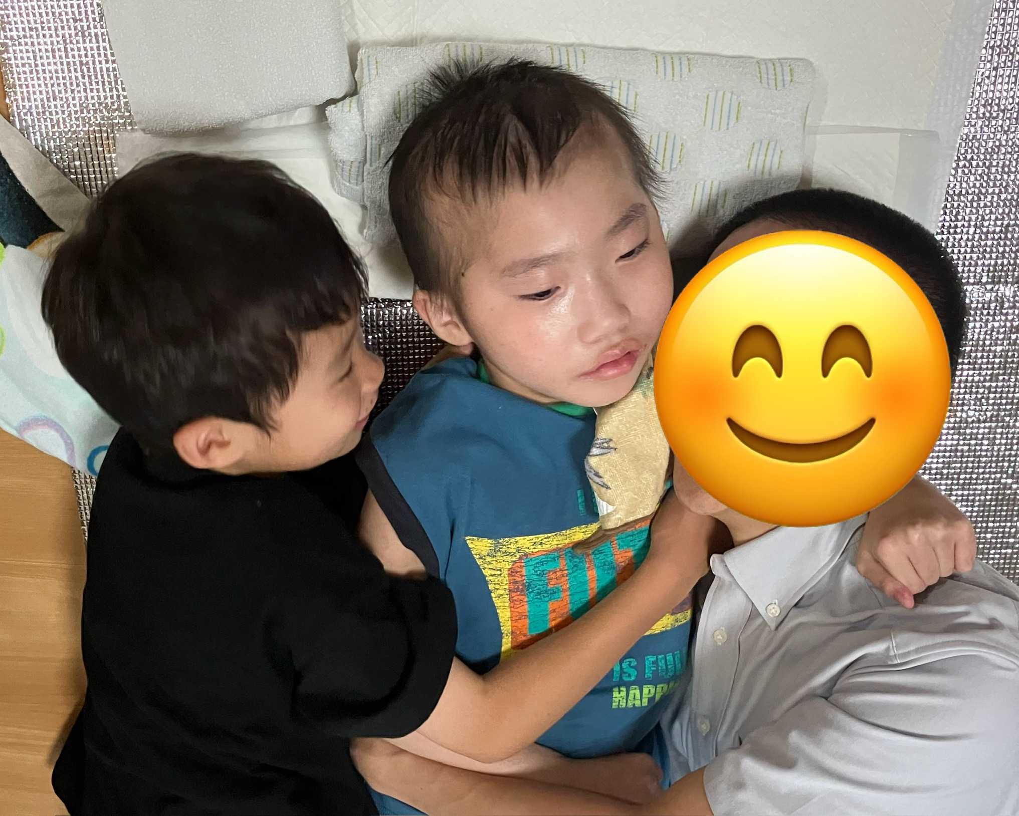 マットにゴロンする長男🐻にハグするパパと次男🐒