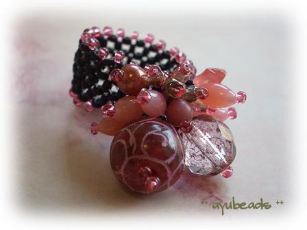マットな黒のボヘミアンビーズにチェリーローズカラーの天然石やヴィンテージビーズなどをセレクトしました。 色の組み合わせはなんとなくアジアン風?? このリングはshopにてお買い求めいただけます。shopの入り口は↑こちら。 ←応援ポッチお願いします。